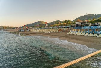 Собствен, пясъчно – чакълест, на 100 м през път, притежаващ сертификат "Син флаг". Чадъри, шезлонги и плажни кърпи на плажа и при басейна – безплатно.