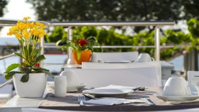 Ресторантът работи от обяд до късно вечер, предлагайки съвременна средиземноморска кухня.