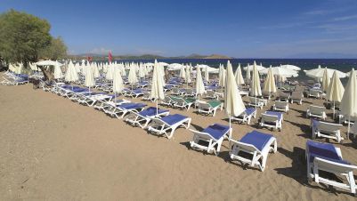 Собствен, пясъчно - чакълест. Чадъри, шезлонги на плажа и при басейна – безплатно. Плажни кърпи - срещу депозит.