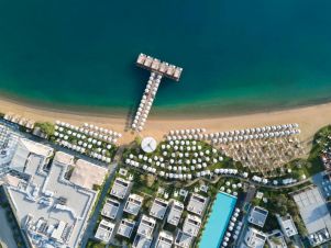 Собствен - 300м пясъчен, разделен на две части - фамилна и само за възрастни 16+; 2 платформи - чадъри, шезлонги и матраци на плажа и при басейна - безплатно.
