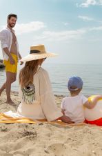 Собствен, пясъчен, притежаващ сертификат "Син флаг" (дължина 200 м), на 50 м от хотела (преминаване през подлез на хотела).Чадъри, шезлонги, матраци и плажни кърпи на плажа и при басейна – безплатно. Бар на плажа от 09:00 до 17:30 часа (безплатни топли и студени напитки, бира).