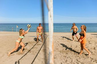 Собствен, пясъчно-чакълест, платформа. Чадъри, шезлонги и плажни кърпи на плажа и при басейна – безплатно.