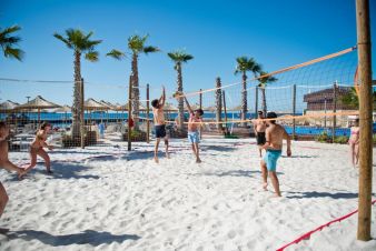 Собствен, пясъчен, платформа– чадъри и шезлонги на плажа и при басейна – безплатно, плажни кърпи - срещу депозит. Плажа е носител на сертификат за "Син флаг"