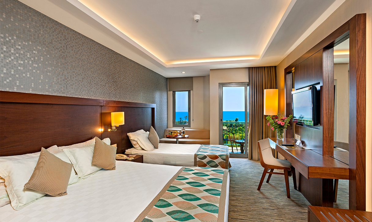 Стаи Main Blocks: 323 стандартни стаи, от които Standard Room Garden View (изглед градина, 30-35 м2), Standard Room Sea View (изглед море, 30-35 м2), 65 Family room (2 спални, 1 баня - 50 м2). 26 делукс стаи, от които Deluxe room garden view (изглед градина, 27-45 м2), Deluxe room sea view (изглед море, 27-45 м2), 2 King suite room (2 спални, 1 хол, 2 бани - 85 м2),  4 Honey moon Suit (стая за младоженци, спалня, баня + джакузи - 45 м2).