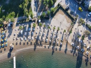 Собствен, пясъчно - чакълест. Чадъри, шезлонги и плажни кърпи на плажа и при басейна - безплатно.