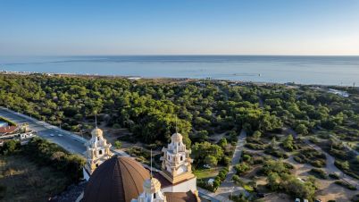 Собствен, пясъчен на 300 м. от хотела. Чадъри, шезлонги и матраци на плажа и при басейните – безплатно.