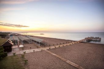 Собствен, пясъчен. Чадъри, шезлонги и плажни кърпи на плажа и при басейна - безплатно.