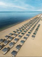 Собствен, пясъчно - чакълест. Чадъри, шезлонги и плажни кърпи на плажа и при басейна – безплатно.