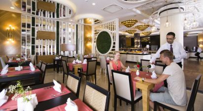 Основен ресторант, 2 а-ла-карт ресторанта (с предварителна резервация), 3 бара, дискотека, открит и закрит басейн, магазини, СПА център. За децата:Детско меню, детски басейн, мини клуб (04-12г.) Безплатни услуги: Сауна, турска баня, парна баня, фитнес, аеробика, гимнастика, плажен волейбол, тенис на маса, билярд, дартс, водна топка, анимация, вечери шоу програми. Платени услуги: Масаж, пилинг, фризьор, магазини, пералня, детегледачка, моторни водни спортове.